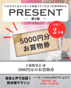 熊本シティエフエムでは当日ランナーの皆様がゴールまで気持ちよく走ってもらうため、ランナーのための音楽番組を放送します!